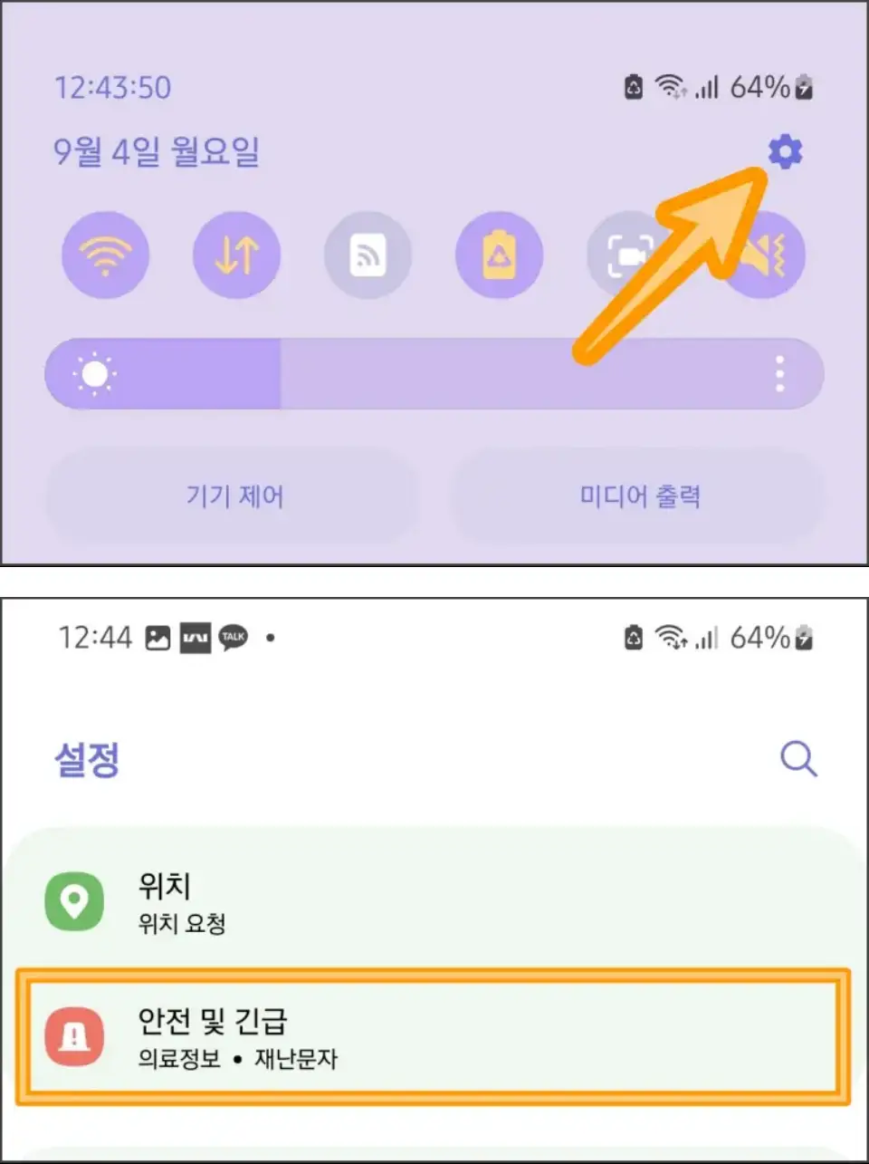 ▲ 화면 상단을 내려서 우측 상단 [톱니 바퀴] 아이콘을 눌러 설정창으로 들어갑니다. 스크롤을 내리다 보면 [안전 및 긴급] 메뉴가 보입니다. 터치해 주세요.